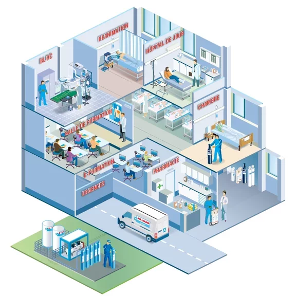 Air Liquide Healthcare pone a disposición de sus clientes todo su conocimiento y amplia experiencia en el diseño, ejecución y mantenimiento de los sistemas de distribución de gases medicinales. A continuación se enumeran algunos de los elementos que forman parte de dichos sistemas: